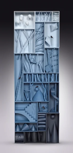 (Wood, paper, pvc, resin birds and books)
